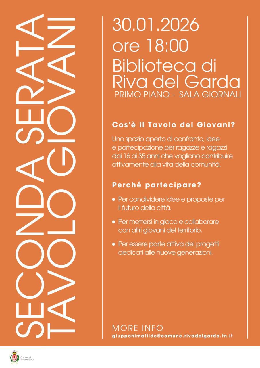 L’appuntamento è quindi venerdì 30 gennaio nella sala conferenze al terzo piano della biblioteca con inizio alle ore 18. Si può comunicare con Matilde Giupponi all'indirizzo email giupponimatilde@comune.rivadelgarda.tn.it.