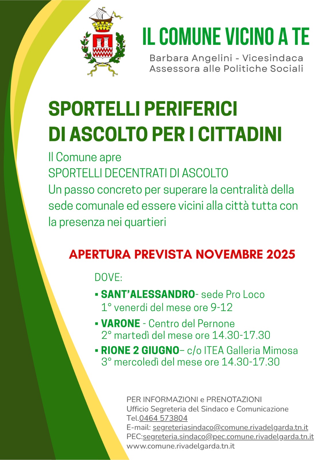 Tre Sportelli periferici di ascolto per i cittadini con cui l’amministrazione comunale intende avvicinare le persone e ascoltare quello che hanno da dire, per essere vicina e per dare risposte. Un passo concreto per superare la centralità della sede comunale ed essere vicini alla città tutta con la presenza nei quartieri.