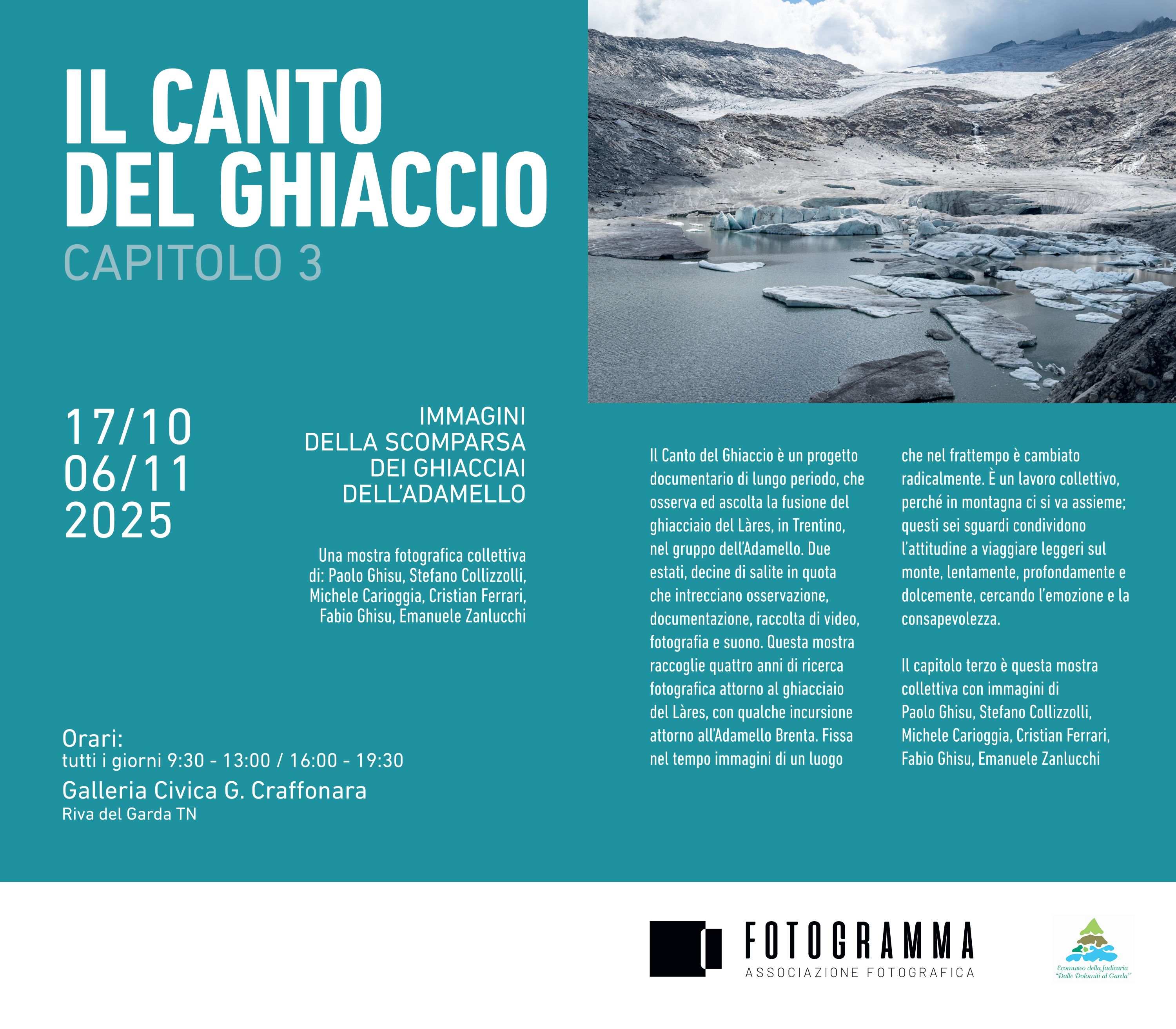 «Il canto del ghiaccio» è un progetto documentario di lungo periodo che osserva e ascolta la fusione del ghiacciaio del Làres, in Trentino, nel gruppo dell’Adamello. Due estati, decine di salite in quota che intrecciano osservazione, documentazione, raccolta di video, fotografia e suono. Questa mostra raccoglie quattro anni di ricerca fotografica attorno al ghiacciaio del Làres, con qualche incursione attorno all’Adamello e al Brenta. Fissa nel tempo immagini di un luogo che nel frattempo è cambiato radicalmente. È un lavoro collettivo, perché in montagna ci si va assieme; questi sei sguardi condividono l’attitudine a viaggiare leggeri sul monte, lentamente, profondamente e dolcemente, cercando l’emozione e la consapevolezza. Il capitolo terzo è questa mostra collettiva con immagini di Paolo Ghisu, Stefano Collizzolli, Michele Carioggia, Cristian Ferrari, Fabio Ghisu, Emanuele Zanlucchi.