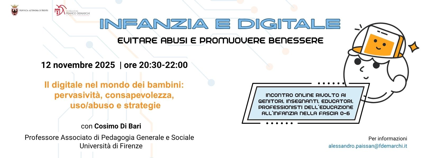 Il primo incontro, mercoledì 12 novembre dalle 20.30 alle 22, è tenuto dal prof. Cosimo Di Bari e si intitola «Il digitale nel mondo dei bambini: pervasività, consapevolezza, uso/abuso e strategie.»