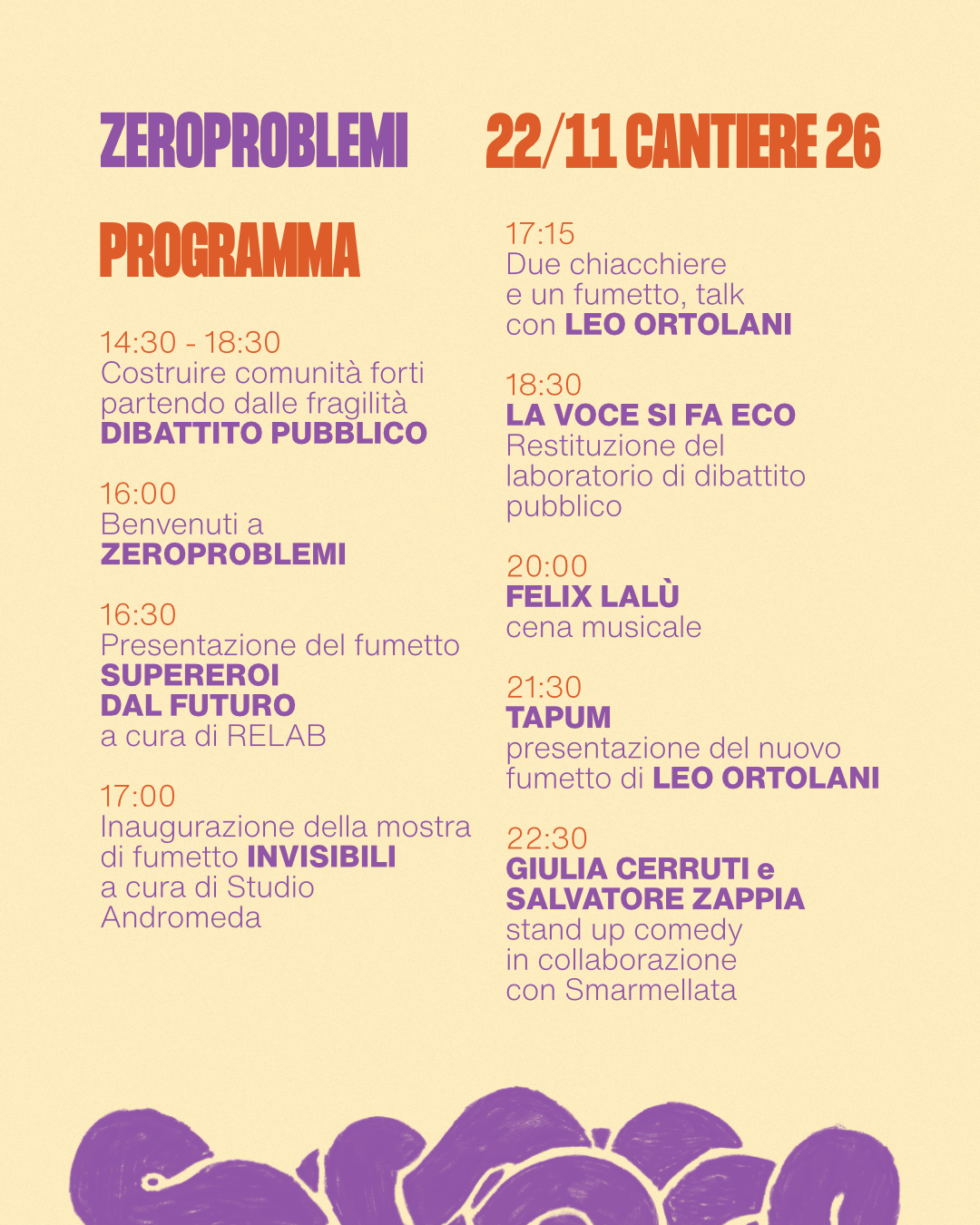 Il dibattito pubblico rappresenta il cuore dell’iniziativa, che prende il nome di Zeroproblemi, ma il programma dell’evento non si ferma qui: ospite speciale della giornata sarà Leo Ortolani che ci farà compagnia con quattro chiacchiere pomeridiane e alle 21.30 racconterà il suo ultimo libro, «Tapum» (Feltrinelli Comics), importante opera dall’ampio respiro ambientata durante la prima guerra mondiale che sta riscuotendo un grande successo tra gli appassionati di fumetto e non solo.