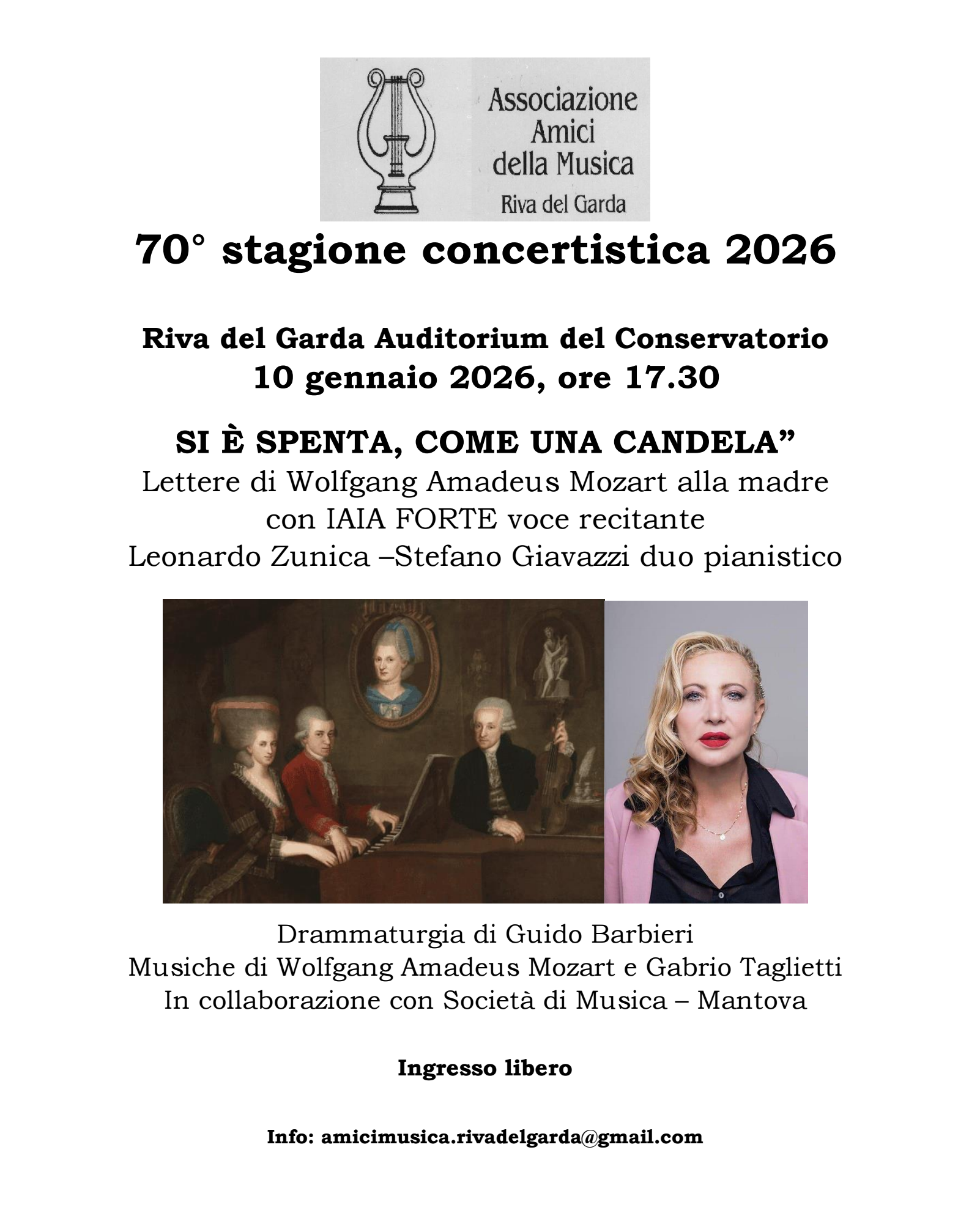 Lo spettacolo, il 9 gennaio in scena al teatro di Bibiena come anteprima della stagione concertistica 2026 di Mantova Musica, è il giorno successivo a Riva del Garda. L’evento è organizzato dall’associazione Amici della musica in collaborazione con la Società di musica di Mantova. Ingresso libero, informazioni all’indirizzo amicimusica.rivadelgarda@gmail.com