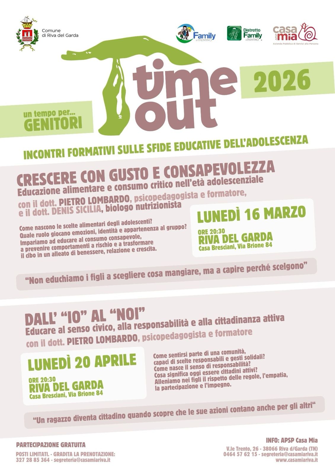 Da sedici anni Time Out si propone come un solido punto di riferimento per la formazione dei genitori, offrendo occasioni di incontro, formazione e crescita per genitori, educatori e ragazzi. L’obiettivo centrale è sostenere la riflessione sul rapporto tra adulti e adolescenti, mettendo a fuoco il significato profondo che questa fase della vita assume all'interno del nucleo familiare.
