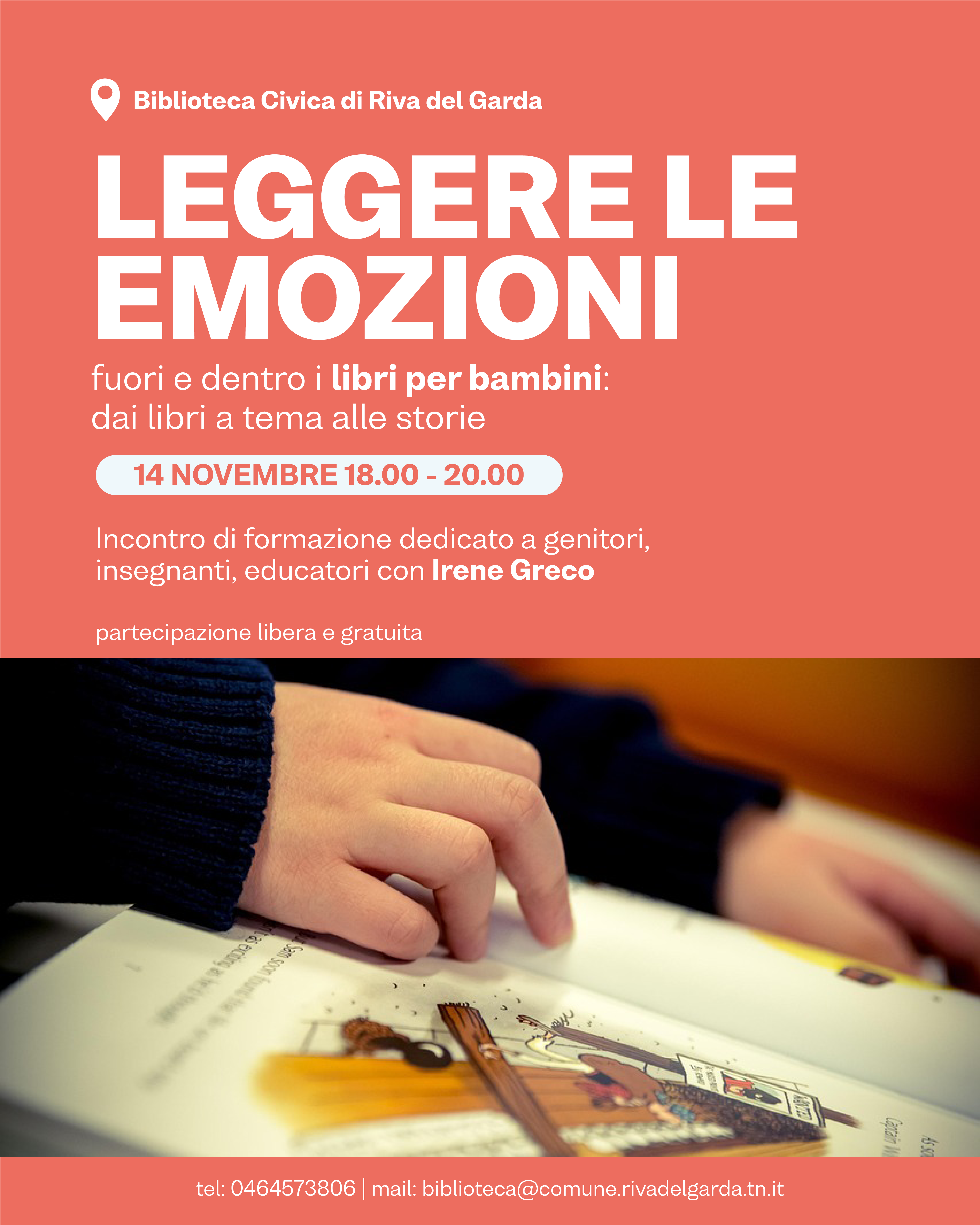Venerdì 14 novembre dalle 18.00 alle 20.00 la Biblioteca vi invita all'incontro formativo "Leggere le emozioni fuori e dentro i libri per bambini: dai libri a tema alle storie", a cura di Irene Greco, ideatrice dal 2017 del progetto "Leggimiprima" che prevede incontri di formazione per adulti e ragazzi e laboratori per le scuole di ogni ordine e grado. L'incontro è pensato per genitori, insegnanti, educatori, bibliotecari ma è aperto a chiunque voglia approfondire la tematica di come vengono trattate le emozioni nei libri per bambini.