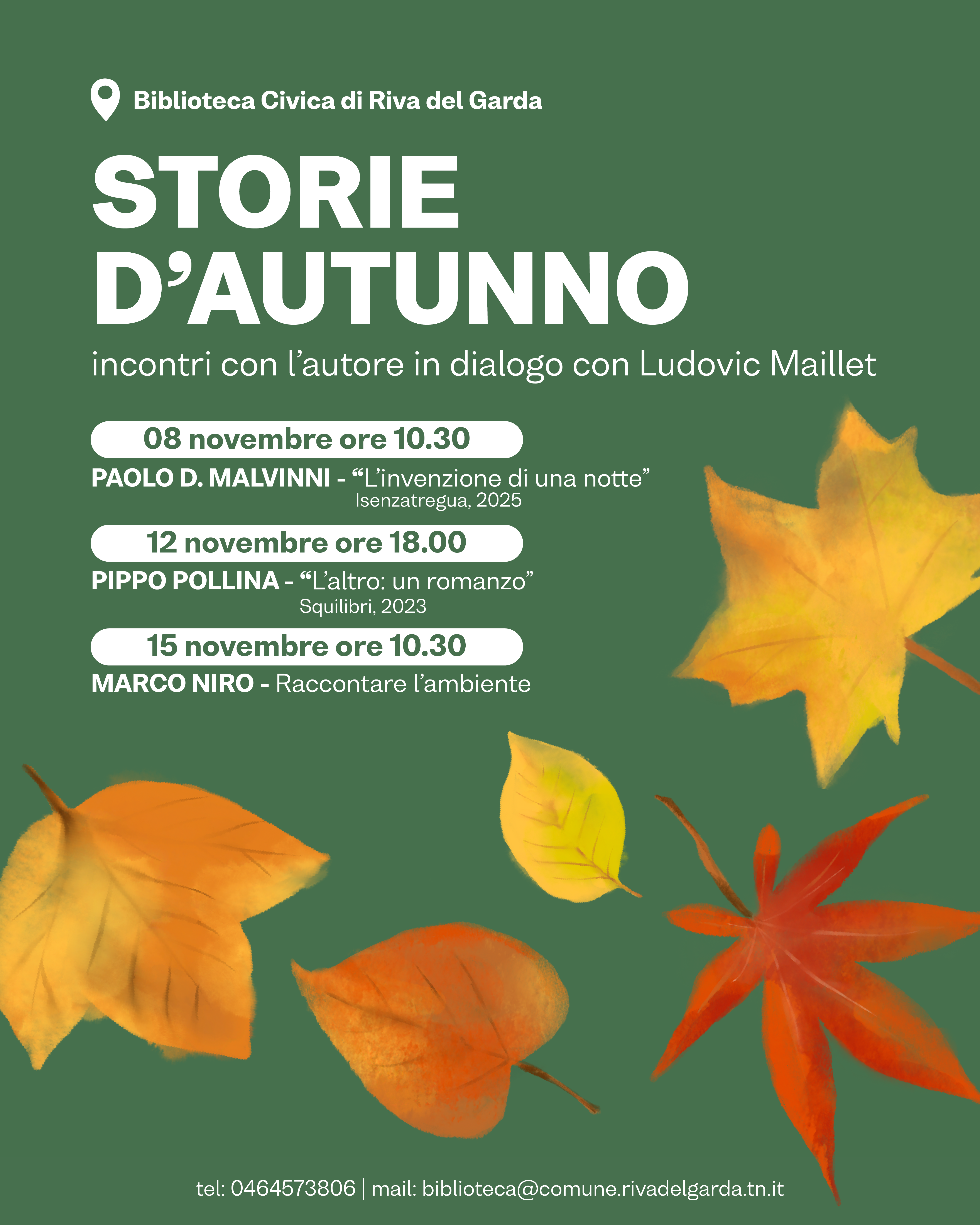 Secondo appuntamento del ciclo "Storie d'autunno". Questa volta a dialogare con Ludovic Maillet sarà Marco Niro, che è già stato nostro ospite qualche mese fa per parlare del suo ultimo romanzo: durante questo incontro invece dialogherà con Maillet riguardo il raccontare le tematiche ambientali, che da sempre contraddistinguono la sua produzione letteraria.