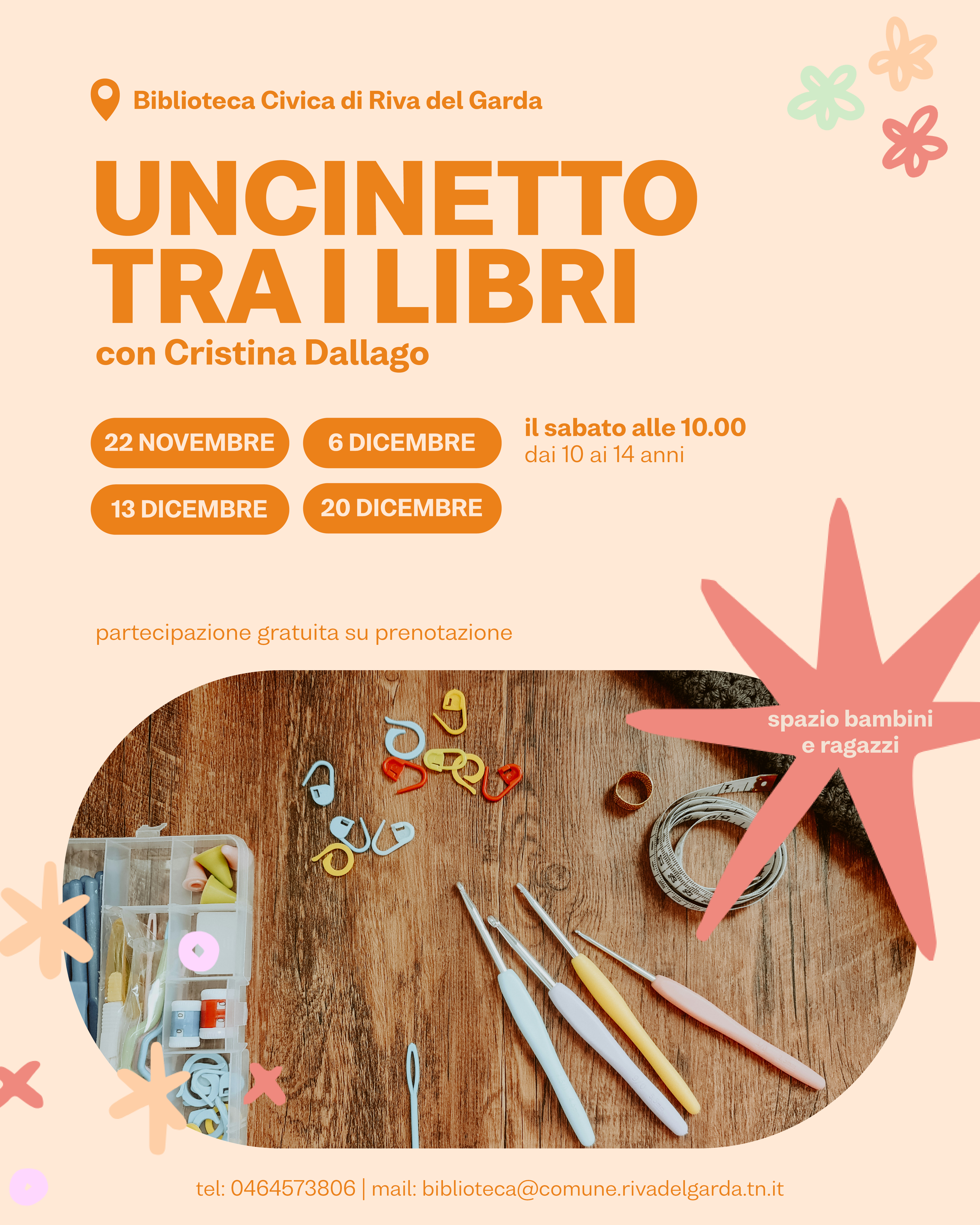 Sabato 22 novembre prende il via in Biblioteca "Uncinetto tra i libri", un percorso creativo dedicato a ragazze e ragazzi dai 10 ai 14 anni che desiderano avvicinarsi all'arte dell’uncinetto in modo semplice e divertente.